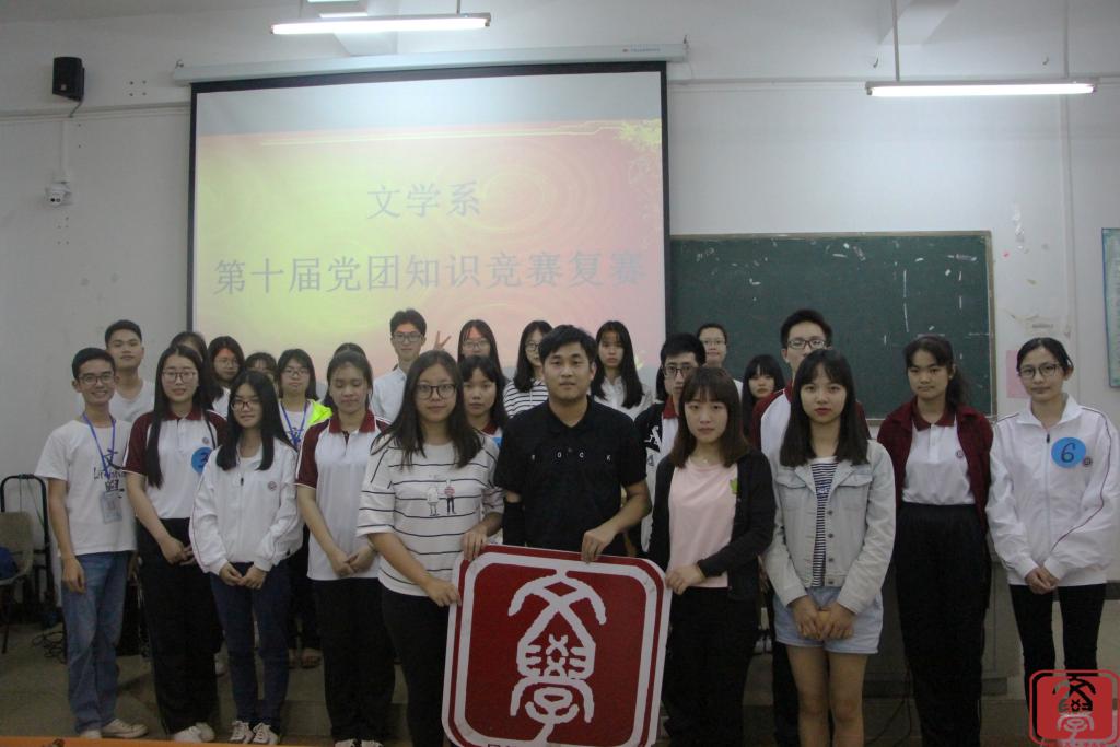 党团青年,勇往直前——文学系第十届党团知识竞赛复赛2017年4月11日星期二19点,广东财经大学华商文学院文学系团总支组织部承办的第十届党团知识竞赛复赛在励志B204举行。出席本次竞赛现场的嘉宾有文学系团总支书记兼学生会指导老师唐志壕、文学系学生会主席张意、文学系学生会副主席朱慧心、汤颖。主持人比赛伊始,主持人宣布此次竞赛主要由三个环节构成,并且实行积分制。紧接着,一小段参赛选...