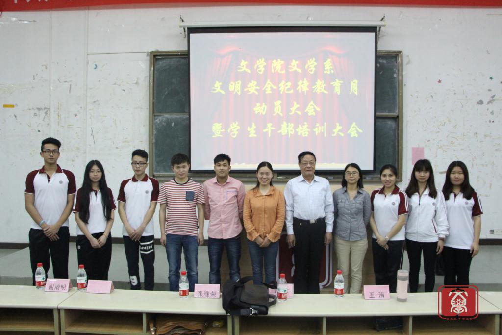2016年4月6日晚19:00整,广东财经大学华商文学院文学系文明安全纪律教育月动员大会暨学生干部培训大会于励志楼B207举行。出席本次大会的老师有:文学院文学系主任尹康庄,文学系分管学生工作副主任张继荣,文学系团总支书记兼学生会指导老师唐志壕,以及文学系辅导员王洁、谢清明。