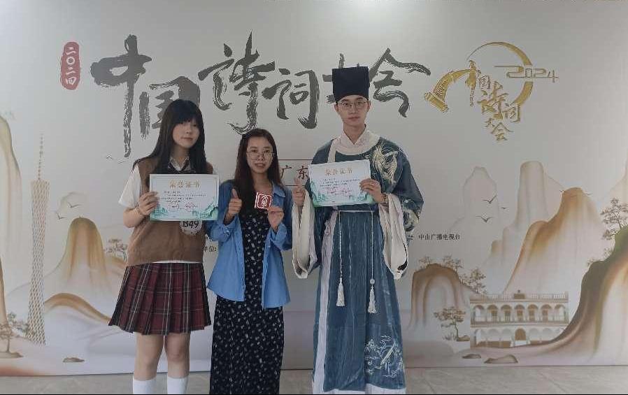 图片一:汉语言文学专业学生郑镇鑫(右)、林妙璇(左)晋级“中国诗词大会”央视百人团选拔赛