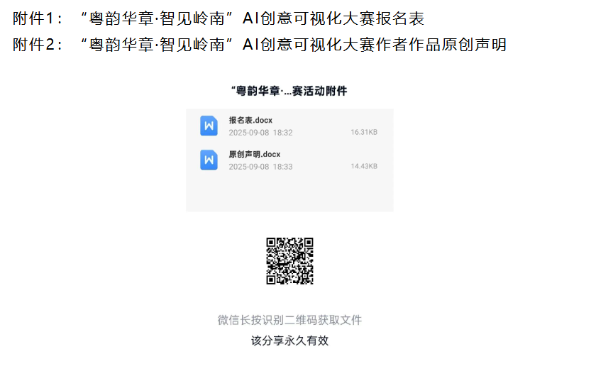 报名要求:将作品、报名表及原创声明(见附件)压缩至一个文件夹,打包发送至大赛指定邮箱1370716513@qq.com,作品及相关文件统一命名为“岭南文化可视化大赛-学院-XXX(个人/组长姓名)-作品名称-具体文件类型名称(如‘作品阐述表’‘原创声明’)”,截止日期为9月30日。