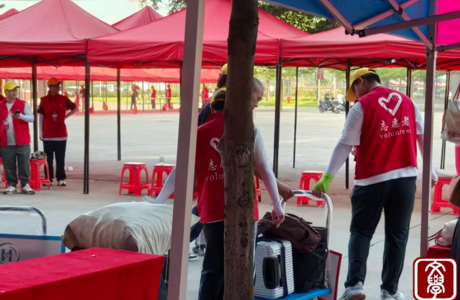 校门作为新生踏入校园的“第一站”,文学院志愿者们已在此等候。他们穿着醒目的红色志愿服,推着蓝色行李车,每当载着新生的车辆缓缓停下,志愿者们立刻上前熟练地接过行李箱、编织袋,稳妥安置在推车上,引导新生们前往宿舍区。从校门口到宿舍楼的这段路,志愿者们推着小车穿梭在校园小道上,汗水浸湿了后背,但脚步始终没有停歇。