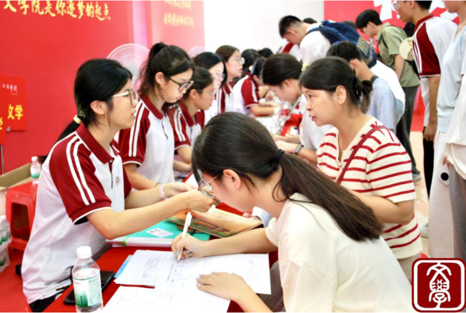文学院迎新大本营的报到工作也在有序开展,在文学院红色背景板前,学长学姐们熟练地操作报到系统,仔细核对新生信息,确保每一项数据准确无误。桌上的报到表、助学贷款手册放得整整齐齐,签字笔也摆成了一排。同时,文学院还为新生们准备了定制纪念扇,扇面上的文学元素设计精巧,既为初秋的校园带来一丝清凉,也传递着学院的人文情怀;面对新生们的各种问题,学长学姐们也是耐心解答,现场秩序良好。