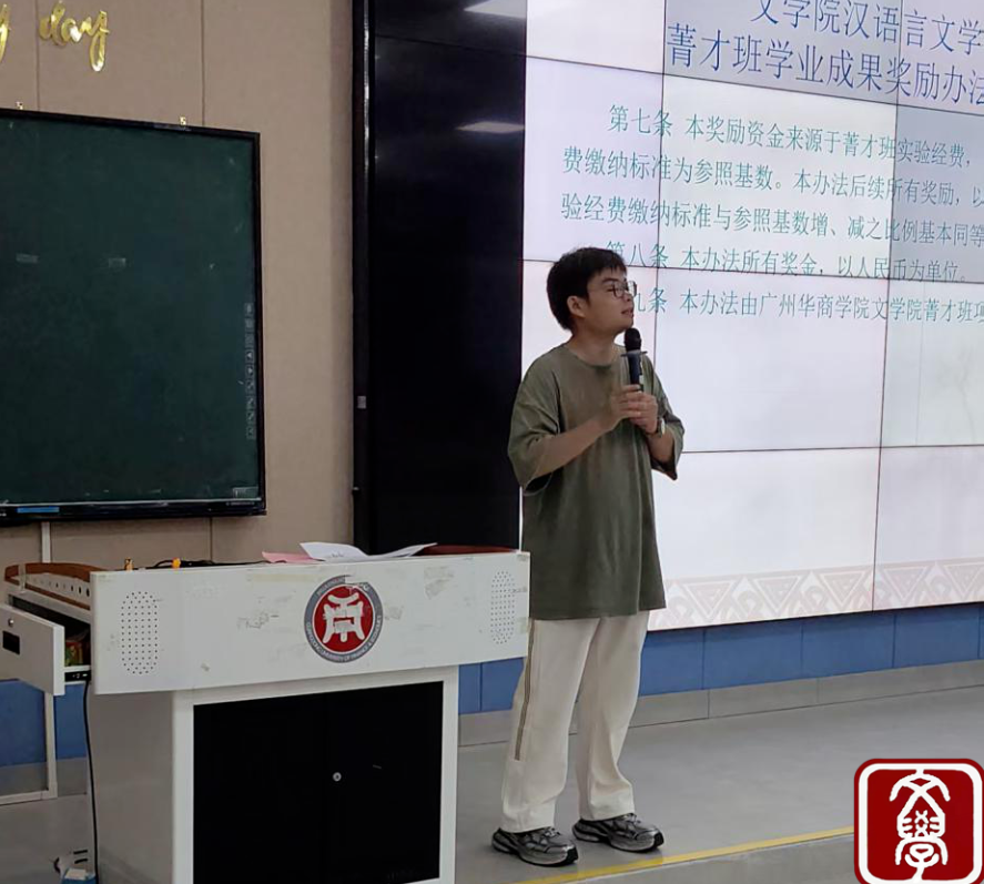 为深入落实文学院“守正创新、交叉融合、应用为要、数字赋能”的人才培养理念,帮助2025级文学院汉语言文学(菁才班)新生快速融入学院环境、明晰专业发展方向,学院于10月13日晚20:30在广州华商学院肇庆校区8号楼109课室召开汉语言文学(菁才班)专业教育会议。 参加本次会议的有文学院院长陈少华、文学院副院长兼党委书记伍世昭、文学院副院长兼党委副书记郭堪通、菁才班班主任朱灿老师、张金龙老师、门学坤老师以及2025级汉语言文学(菁才班)全体新生。 首先是文学院副院长兼党委书记伍世昭进行发言。伍书记强调,菁才班有独立的人才培养方案与课程设置,注重培养学生应用能力,推行每人一部作品集。同时注重学生学业,鼓励学生参加英语比赛、学科竞赛、发表作品,将按不同等级给予奖励。校领导高度重视菁才班学生培养,配备优质师资,提供专属自习室等资源,资源优势明显。