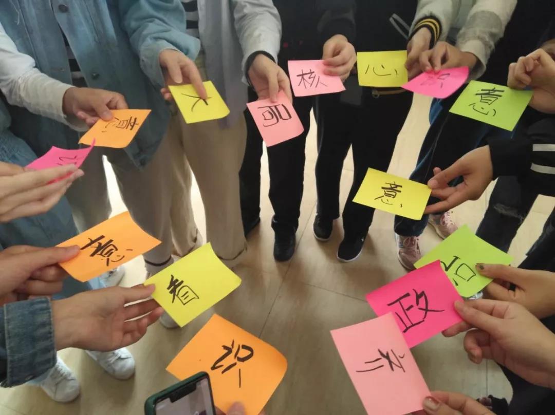 另一边,17级汉语言文学2班的同学们手上都拿着颜色内容都不同的便利贴,看得文学系的小狙击手都有点混乱了,原来这是贴在每个同学背后的便利贴,大家要在15分钟之内找到自己的同伴,让队伍的便利贴上面的字成为一个完整的党的理论。大家在游戏过程中获得快乐之余,也能进一步地了解了党的理论了呢。