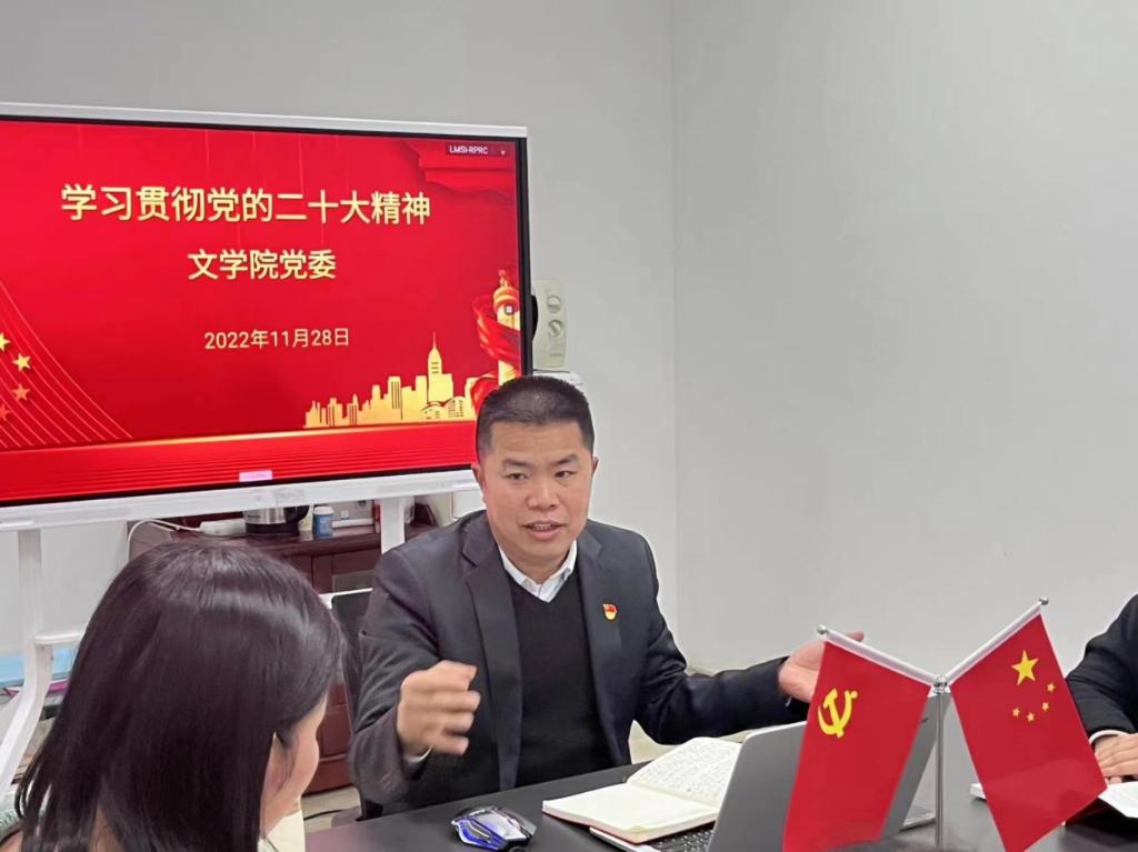 11月28日,文学院党委召开党委会会议学习贯彻党的二十大精神,会议由党委副书记郭堪通主持,党委纪检委员陈晔同志领学,全体党委委员以及文学院各党支部书记参加。郭堪通同志指出,要把学习好宣传好贯彻好党的二十大精神作为当前和今后一个时期的首要重大政治任务,要用党的二十大精神统一思想、凝聚共识、坚定信心,引导党员师生踔厉奋发、勇毅前行。