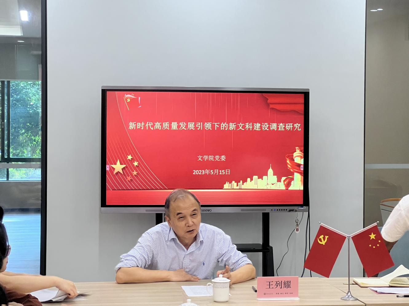 为有力推动学习贯彻习近平新时代中国特色社会主义思想主题教育走深走实,5月15日下午,学校副校长王列耀深入我院开展“新时代高质量发展引领下的新文科建设”的主题调研。我院院长苏桂宁、党委副书记郭堪通、副院长蒋家国、李保民、伍世昭以及我院部分教授和老师参与调研座谈。此外,我院邀请北京师范大学文学院中国现当代文学研究所所长沈庆利教授参加本次调研。