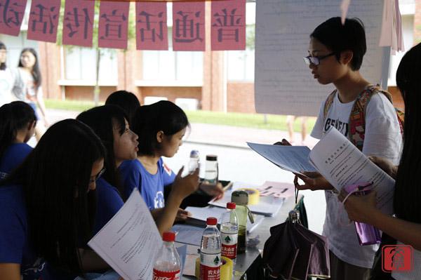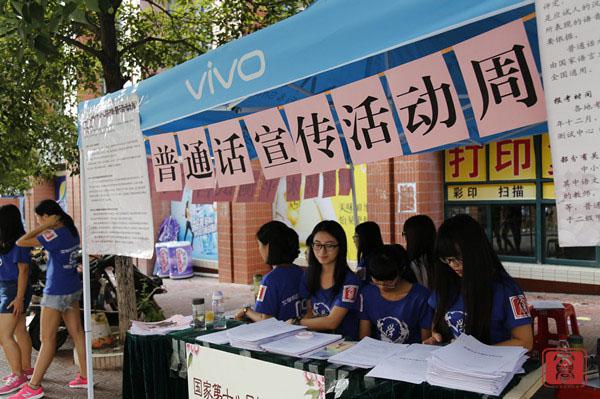 2015年9月15日下午两点,我院为了响应国家第十八届普通话推广周,同时让全院师生更多地了解《国家通用语言文字法》和《普通话水平测试》的相关知识,在雅悦超市旁设立了摆摊咨询点,以方便各位师生到场进行咨询。本次活动受到了学院领导的重视,教务处源国伟处长、郭庆潮老师、华商文学院文学系尹康庄主任、文学系团总支学生分会唐志壕书记莅临现场指导。