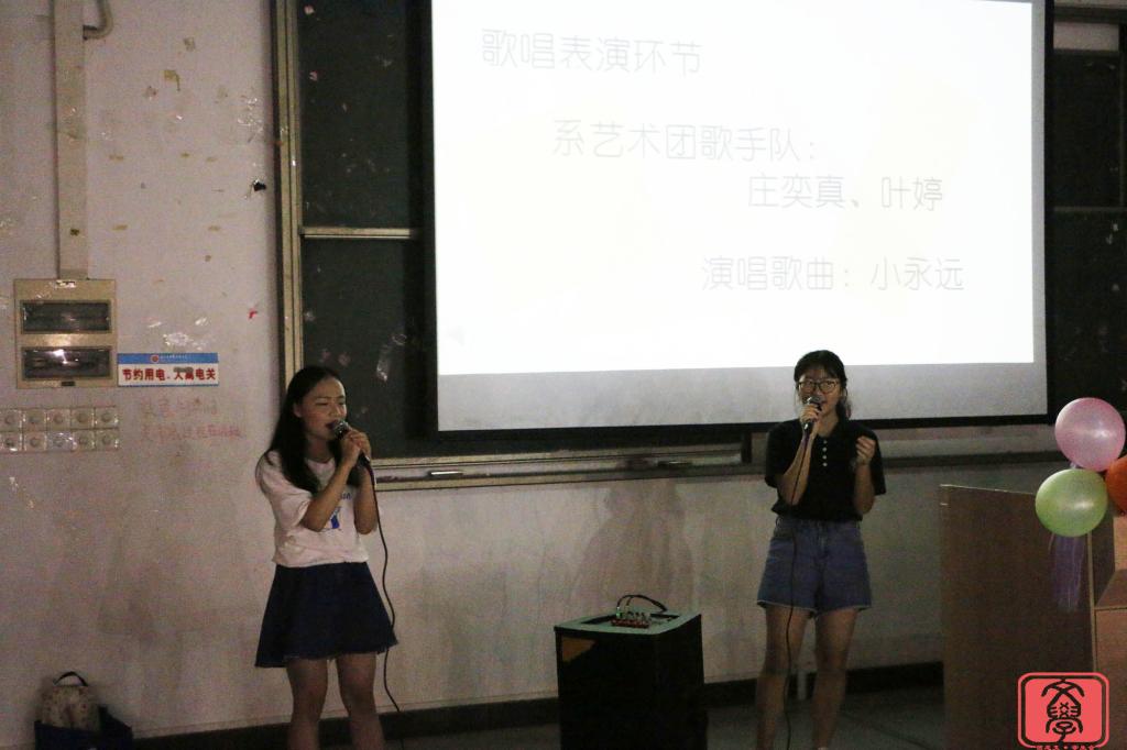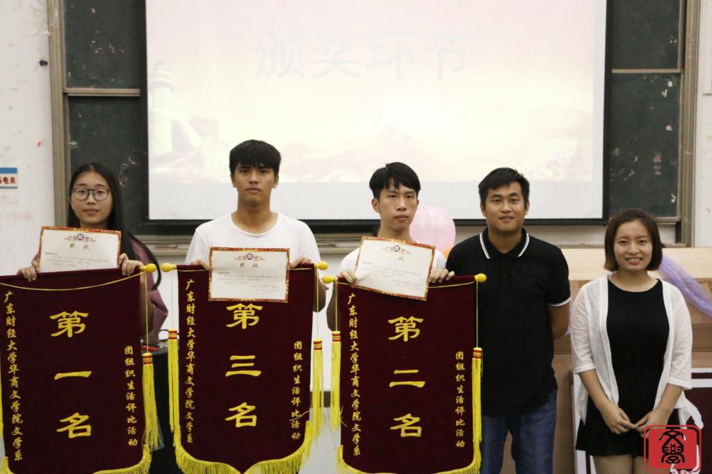 展示结束后,大会的气氛在一曲由文学系艺术团歌手队队员庄奕真、叶婷演唱的《小永远》中推向高潮。一曲过后,由唐志壕书记领队的五人小组在第二轮传接绕口令游戏中稳胜学生队,赢得现场观众的阵阵掌声。通过现场投票,获得班级团生活动的前三名分别是16级汉语言文学1班、16级汉语言文学2班、16级广告学3班,而获得“主题海报”最佳创意奖的班级是16级汉语言文学2班,最终本月团生评选前三名的班级分别是:16级汉语言文学2班、15级新闻学1班、16级汉语言文学3班。
