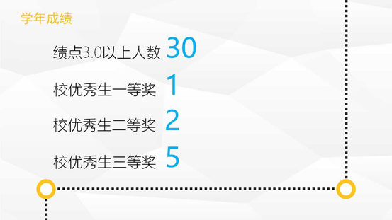 2015——2016学年,我班有三位同学学年绩点在3.5(含3.5)以上,学年绩点3.0以上的人数占班级人数的50%,且学年挂科率为2015级同专业中最低的班级。