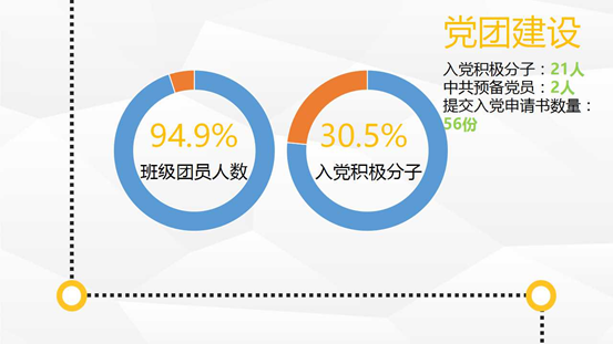 我班目前有中共预备党员两位,同专业班级仅本班有中共预备党员。班级共青团员人数有56人,占全班人数94.9%。入党积极分子有21人,且均接受党课培训并取得结业证书。班级成员积极参与系团支部活动,预备党员积极参与党课学习并取得优异成绩。全班同学秉承服务集体的意识,在院系各组织社团皆有留任。