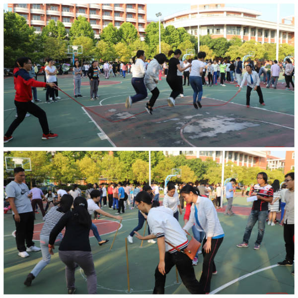 紧接着,比赛进入趣味组合环节,本环节分成不倒森林和集体跳绳两类比赛。不倒森和集体跳绳都林考验团队都验团结协作的能力,比赛现场状况连连,但在各队队员的积极配合下,老师们顺利完成该项比赛。