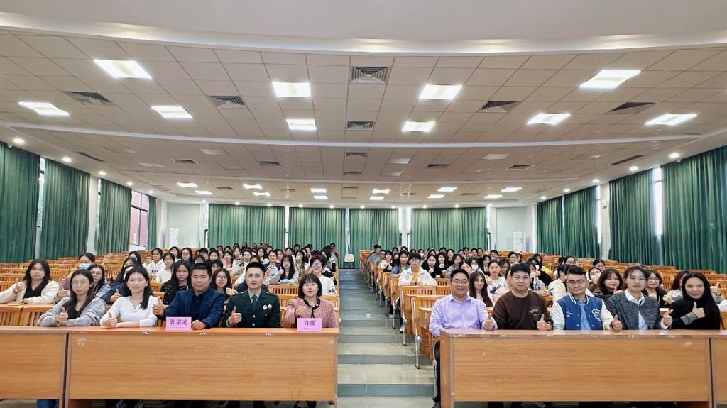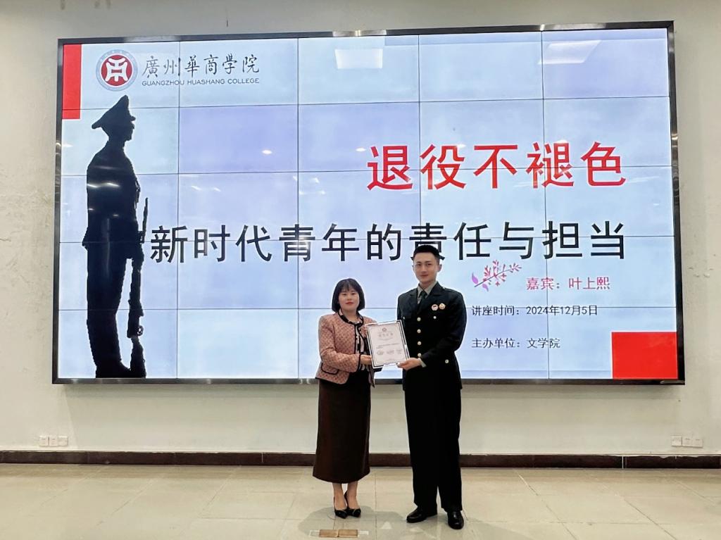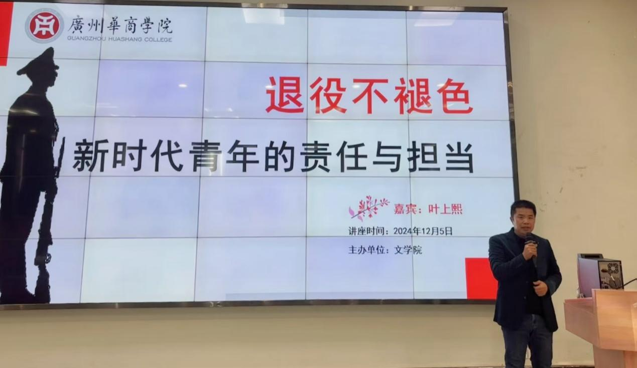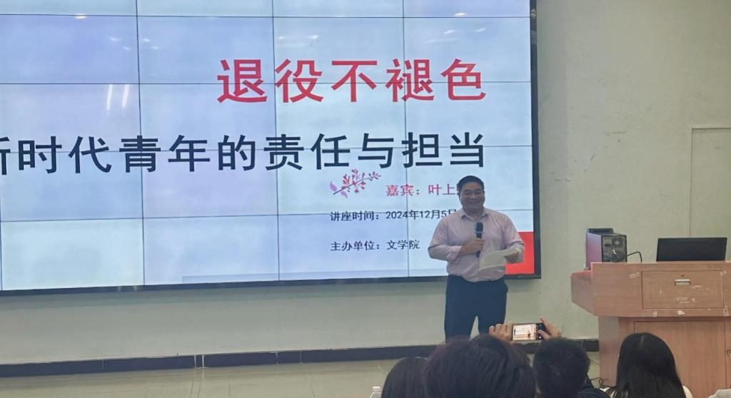 为进一步发挥退役复学大学生士兵典型事迹的引领作用,继承和发扬经部队淬炼形成的光荣传统和优良作风,为他们搭建更广阔的发展平台,鼓励他们在校园内挺膺担当,文学院于2024年12月5日在广州校区举办了以“退役不褪色—新时代青年的责任与担当”为主题的讲座。本次讲座的主讲人是文学院22级本科汉语言文学4班的叶上熙同学。出席本次讲座的领导与嘉宾有广州华商学院副校长许娜、学生处处长黄国富、文学院党委副书记郭堪通、学校武装部老师郭锦荣、文学院学工办副主任王桂华等,有180多名学生参加了此次讲座。