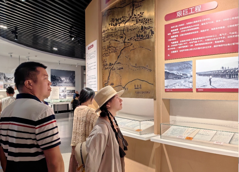 午后的阳光斜照进展厅,老照片里筑路者的身影与青年们在展墙相遇。玻璃柜中,过去使用的铁锹、磨破袖口的棉衣与泛黄的信纸静静陈列:棉衣的棉絮从撕裂的布面探出头,像冻土里钻出的草芽,布料上的油渍与风霜痕迹,藏着冰达坂上的寒与火;泛黄的纸张,似在诉说曾怎样被收信人与亲人之间的感情,裹住过当时所经历的伤口与严寒。 师生们静立展柜前,指尖轻触玻璃上那件旧棉衣的投影,仿佛能触到岁月沉淀的温度。当年筑路者在近零下三十度的冰达坂作业时,这件棉衣便是他们抵御严寒的第二层皮肤——磨薄的肘部泛着经年劳作的光,打补丁的肩头凝着风雪侵蚀的痕,针脚里藏着的风霜与坚韧,恰如“蜀道之难,难于上青天”的千钧重量,每一道磨痕都是刻在时光里的诗行。那被寒风吹硬的布面,曾裹住多少“风刀霜剑严相逼”的夜晚;被体温焐软的棉絮,又藏着多少“路漫漫其修远兮”的执着。这件旧衣无言,却比任何辞章都更鲜活地诠释着“要想富,先修路”的朴素真理,让“通塞”二字在“长风几万里,吹度玉门关”的苍茫意境中,有了沉甸甸的诗性分量——原来每一条贯通山河的路,都是用血汗写就的史诗。
