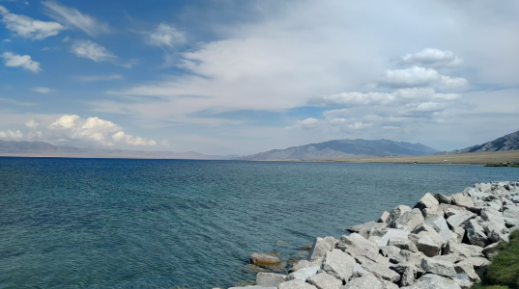 伊犁河谷的阳光炽烈如熔金,研学的第四日,我们的大巴沿着蜿蜒山路,驶向了赛里木湖。到达时正值正午,眼前的景象瞬间洗刷了旅途的倦意。“大西洋最后一滴眼泪”毫无保留地铺展开它的澄澈与壮阔——湖面万点碎金跳跃,暖风裹挟着细碎光尘,草叶被晒得微微发卷,一派盛夏独有的热烈扑面而来。