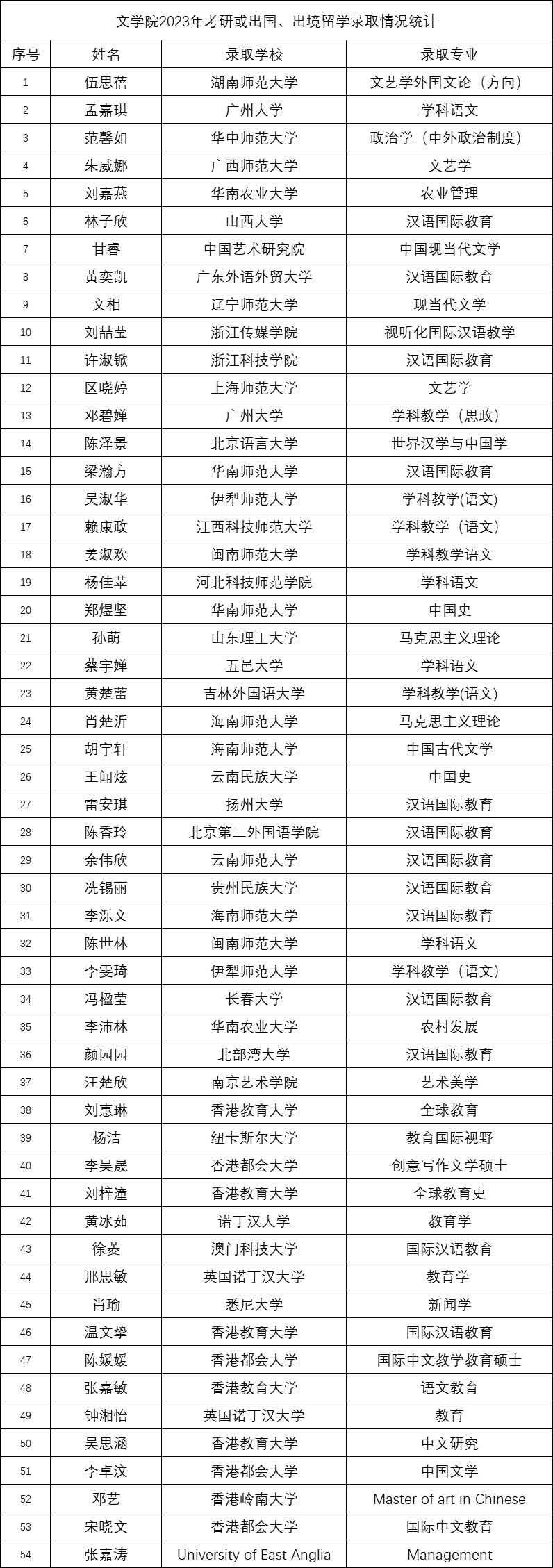 辛勤耕耘有矢志,硕果飘香又一年。近日,我院学生在2023年全国硕士研究生考试中捷报频传,考研成绩喜人,再创历史新高。我院共有54名同学脱颖而出,以优异的成绩被北京语言大学、华南师范大学、上海师范大学、广州大学、广东外语外贸大学等知名高校录取。