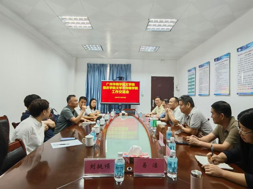 2024年10月23-24日,广州华商学院文学院院长陈少华教授、党委副书记郭堪通老师、副院长徐桃教授、段从学教授、院长助理刘亚娟副教授等一行人前往肇庆学院文学与传媒学院进行为期两天的交流调研活动。23日上午,双方在肇庆学院文学与传媒学院会议室召开了交流会,肇庆学院文学与传媒学院党委书记陈伟林教授、文学与传媒学院党委副书记胡海鹏教授、副院长陈爱香教授、副院长苏常教授、系主任刘挺颂教授、系主任陈伟江教授、鲍昌宝教授、易洁副教授、高贯华老师等人参加了交流活动。