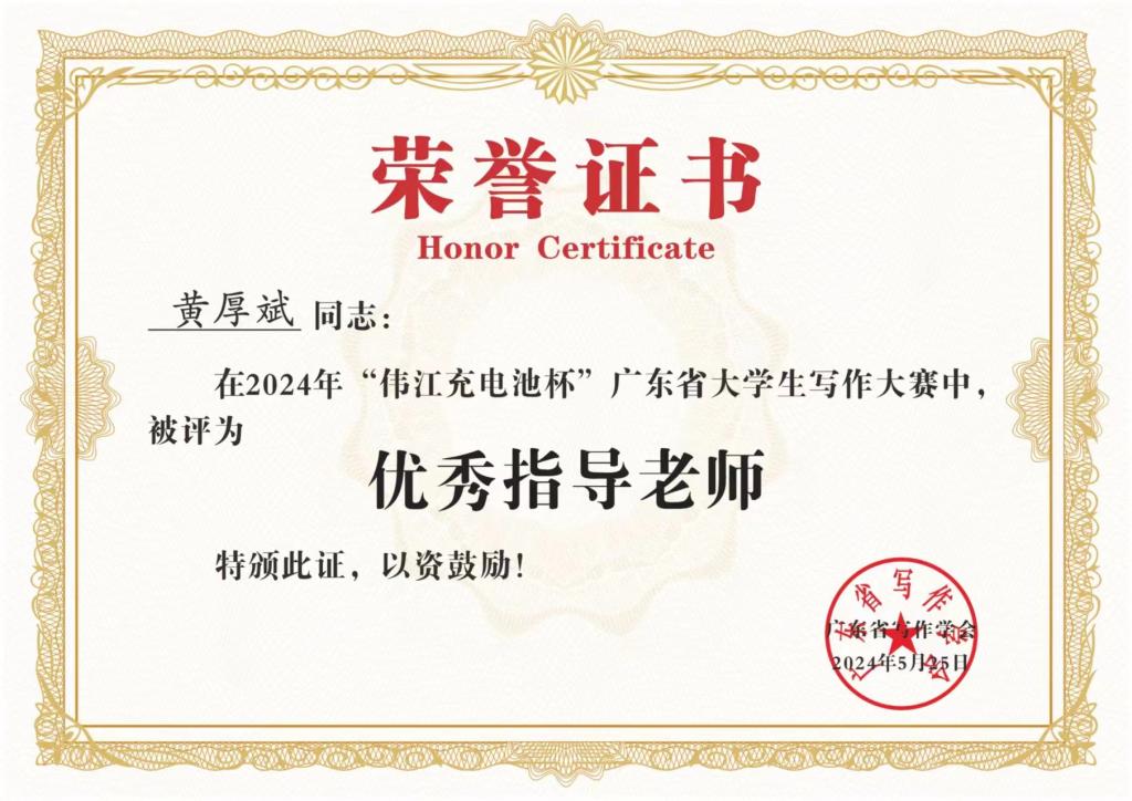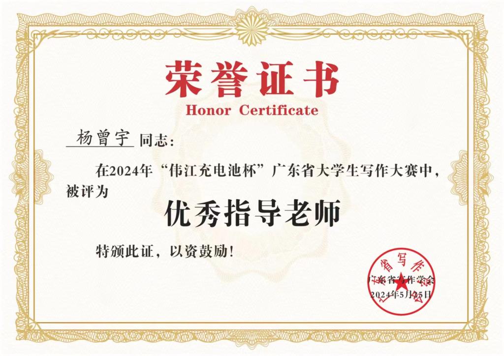 学子的佳绩,离不开老师的谆谆教诲,让我们感谢在此次广东省大学生写作大赛中为学子提供指导的各位老师,助力我校热爱文学创作学子踏上自己的文学之旅。也让我们恭喜我校五位教师在本次大赛中获得“优秀指导老师”称号!