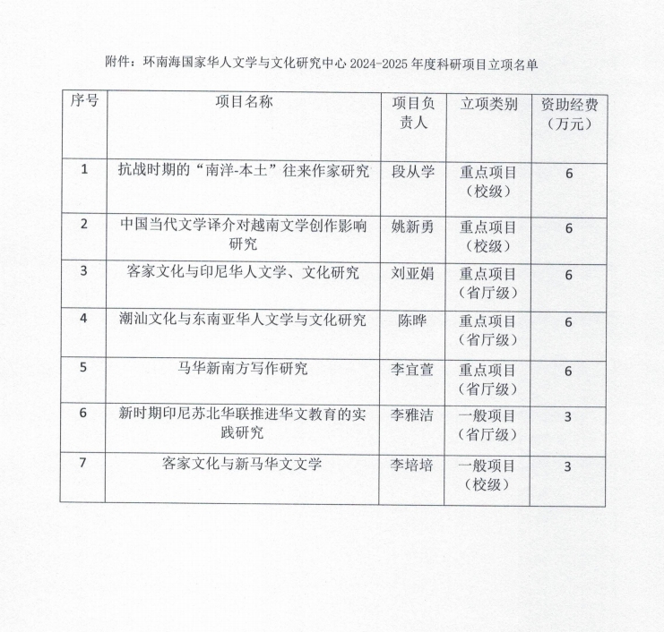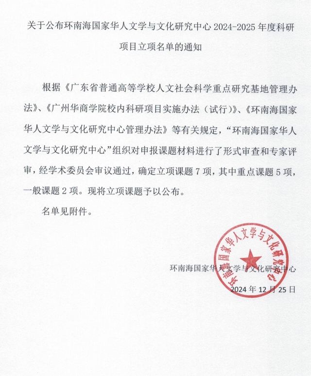 根据《广东省普通高等学校人文社会科学重点研究基地管理办法》、《广州华商学院校内科研项目实施办法(试行)》、《环南海国家华人文学与文化研究中心管理办法》等有关规定,“环南海国家华人文学与文化研究中心”组织对申报课题材料进行了形式审查和专家评审,经学术委员会审议通过,确定立项课题7项,其中重点课题5项,一般课题2项。现将立项课题予以公布。 名单见附件。