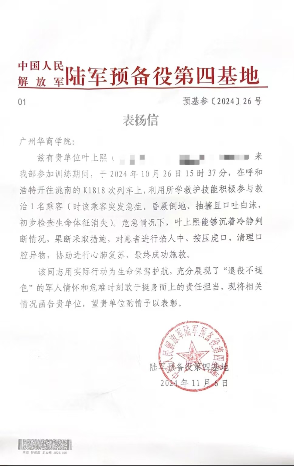 我院22本汉语言文学4班退伍学生叶上熙在参加预备役人员集中训练期间,于2024年10月26日15时37分,在呼和浩特开往洮南的K1818次列车上,参与救治一名突发急症乘客,受到了中国人民解放军陆军预备役第四基地的高度赞扬。