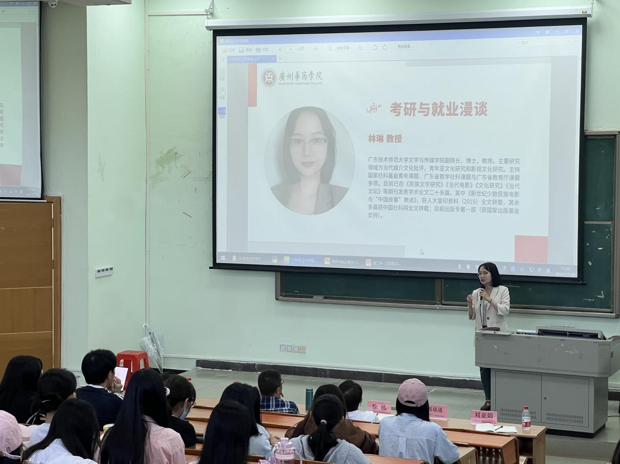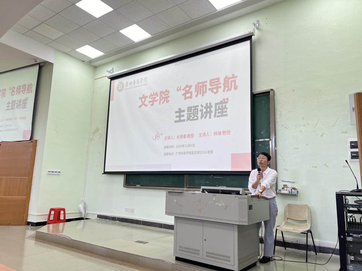 2024年11月8日上午,广州华商学院文学院“名师导航”主题讲座在励志楼D308成功举办。本次讲座旨在为汉语言文学专业和汉语国际教育专业的大四学生提供毕业论文写作指导和考研就业规划。会议特邀广东技术师范大学文学与传媒学院佘爱春教授和林琳教授作为主讲人,文学院徐桃副院长、郭堪通副院长、刘亚娟院长助理、王长杰系主任、陈文博教授、王海玲教授、刘心儿老师等多位老师出席,与学生们共同探讨学术研究与职业发展。