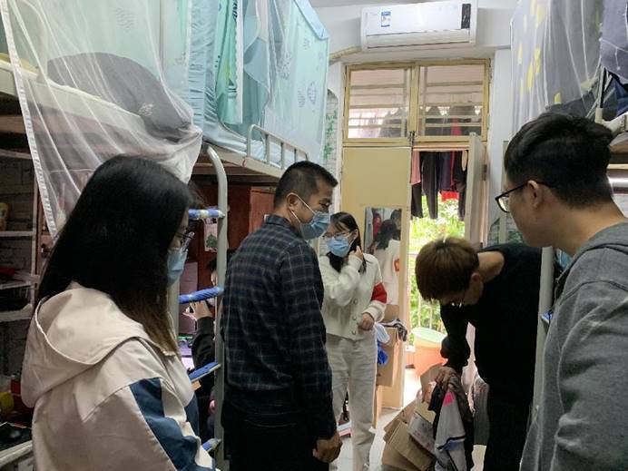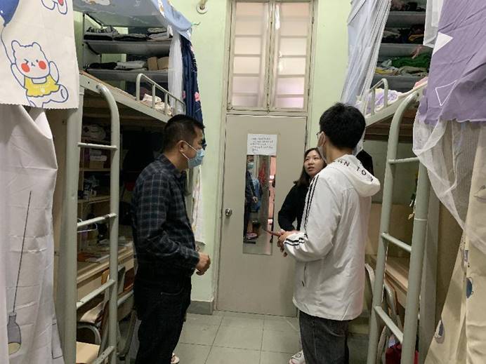 走访过程中,学院领导老师询问了解同学们在本学期的学习生活状况,老师们叮嘱学生要严格遵守学校疫情防控相关规定,做好个人安全防护、坚持华商E家每日健康打卡,宿舍日常保持通风;严格执行“日报告”“零报告”制度,出宿舍务必配戴口罩;减少不必要的网购,收取快递时保持一米距离,做好消毒工作。老师们还耐心解答同学们的问题、认真听取大家的意见建议,并希望每一位同学都要以高度的责任心和强烈的使命感,坚决服从学校的疫情防控工作大局,共筑疫情防控安全线。同学们纷纷表示自己意识到了疫情防控的重要性,今后将会严格遵守学校的各项管理制度和疫情防控规定,以饱满的精神状态投入到学习生活当中去,共同营造良好的宿舍学习生活环境。