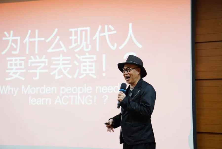 讲座启幕环节,首先由明星表演指导于歆玥带领大家做即兴戏剧游戏,通过“鼓掌”、“跺脚"等简单的动作,让大家体验了身体的表达力与创造力,并在“哈哈"大笑中锻炼了注意力、想象力和节奏感,对PIP有了初体验。随后她分享了《欢乐喜剧人》的创作经历,称表演是一种对生活的热爱与态度,而现代人需要学表演,因生活要快乐、工作要交流,而每个人对表演的理解都因个人经验的不同而有多元的答案。