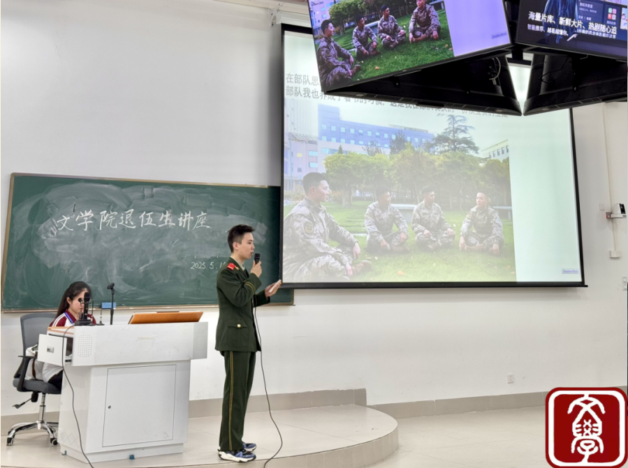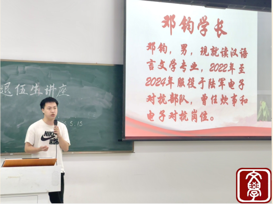为弘扬 爱国主义精神 ,展现新时代青年的责任与担当,激发在校大学生的奋斗热情,文学院 于5月15日19:00在肇庆校区16号楼212教室举办了一场题为“曾着戎装守家国,今穿校服话初心”的专题讲座,三位退伍大学生 走进校园,分享他们在军营的淬火经历与回归校园后的感悟,为同学们带来了一场关于青春与信仰的精神盛宴。