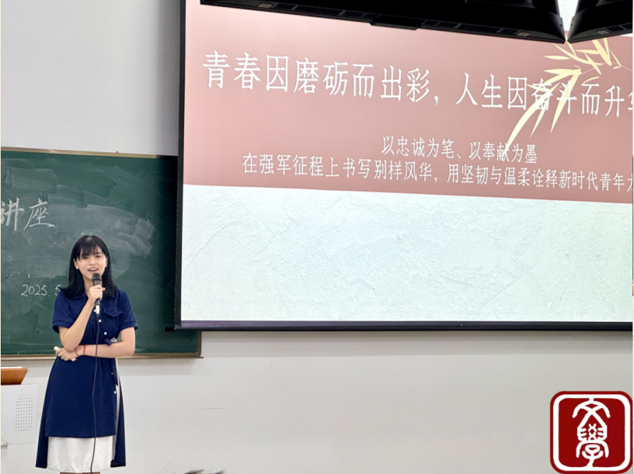 胡书航同学 曾服役于中国人民武装警察部队北京市总队,并在中央广播电视总台执行相关任务。讲座中,他回忆起参军初心,直言自幼便对军人和警察满怀崇拜,这份热忱驱使他毅然踏上军旅征程。他向同学们展示了部队训练照片,每一张照片背后都有一段热血故事。在部队的日子里,红色故事深深感染着他,让他对忠诚与担当有了更深刻的理解;重视思想教育的氛围培养了他阅读习惯,他视之为珍贵的财富。此外,他还分享了部队里多样的文娱活动,这些活动极大地促进了战友间的内部关系团结。谈及回校生活,胡书航同学表示“带着部队赋予的热血,坚持每日锻炼、阅读,生活充实,也明白快乐很简单。”最后他以一段革命视频作为收尾,鼓励大家在青春岁月里勇于担当,为祖国奉献力量。