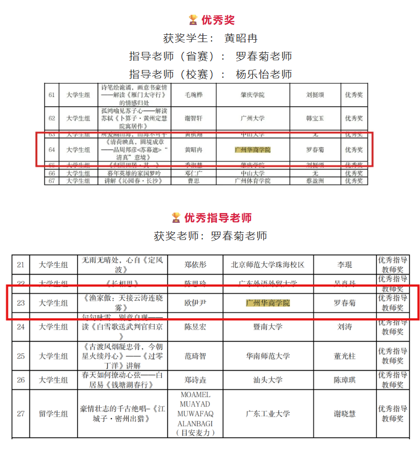 此次在2025年广东省“诗教中国”诗词讲解大赛中取得的优异成绩,是我院学子人文素养和综合能力的有力彰显,也极大地鼓舞了全院师生传承与弘扬中华优秀传统文化的信心与热情。我们再次向所有获奖同学和辛勤付出的指导老师们致以最热烈的祝贺! 期待全院学子继续亲近经典,涵养诗心,不断提升文化自信与表达能力,在传承中华文脉、坚定文化自信的道路上书写更加绚丽的青春篇章! 学院将继续搭建平台、创造条件,支持更多学子在弘扬中华优秀传统文化的广阔舞台上展现才华、实现价值!