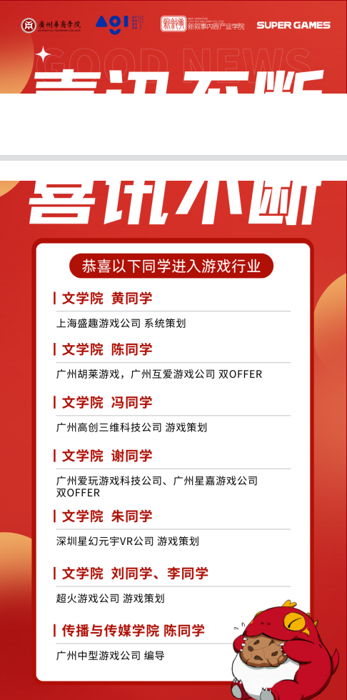 在数字娱乐产业蓬勃发展的当下,我国游戏教育领域迎来重大利好。今年,教育部将游戏艺术设计专业新增至本科专业目录,这-举措标志着我国游戏教育体系向专业化、体系化迈出关键一步,为游戏行业人才培养提供了更为坚实的政策支撑。 同时,动漫游戏产业学院、新叙事内容产业学院与超火游戏学院举办的首届游戏策划班依托优质资源,将产业前沿知识与教育理论深度融合,为学生提供大量参与实际游戏项目策划的机会,在专业导师悉心指导,学生们不断打磨策划能力、积累实战经验下,传来就业捷报! 这一就业佳绩不仅坚定了策划班同学们逐梦的赤诚之心,也为策划班未来发展注入“强心剂”。