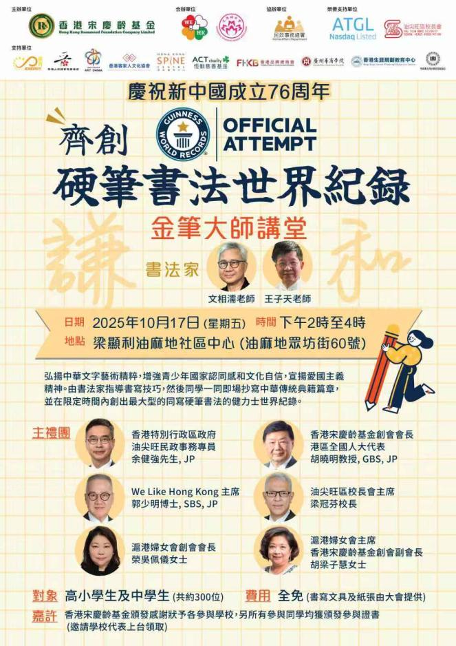 10月17日,香港宋庆龄基金联合多家教育机构,在港举办“齐创硬笔书法世界纪录”活动。近三百名中小学生与教师同堂挥笔,以硬笔书写《论语》《荀子》等中华经典语句。此活动最终以291名有效参与人数,成功打破健力士世界纪录。活动海报认证官颁发“齐创硬笔书法”世界记录证书广州华商学院作为该活动的支持单位,获香港宋庆龄基金会会长胡晓明教授现场颁发感谢状,以表彰学校在推动粤港文化教育协同发展中的积极作用。香港宋庆龄...